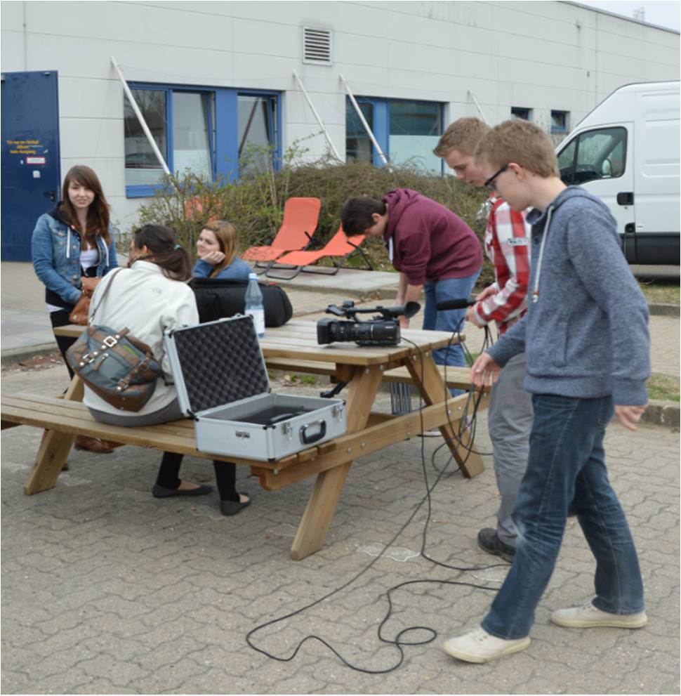 Die Medienscouts üben ihre filmerische Kompetenz zunächst mit einfacheren Techniken, wie z. B. mit einer Interviewaufnahme.